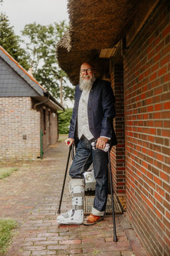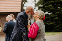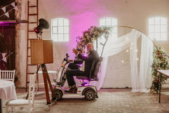 Nach der freien Trauung ist für mich oft eine Art "Freestyle-Time". Ich flitze hin und her, fange die Glückwünsche ein, renne in den noch leeren Saal um ihn ohne Menschen zu fotografieren und knipse kleine Details. Hier habe ich z.B. Maries Stiefpapa erwischt, wie er unsere Fotobox ausprobiert hat. Er hat sich kurz vor der Hochzeit noch verletzt und war leider an einen Walker sowie "AOK-Chopper" angewiesen. In dieser Phase ist auch immer Zeit für Gruppenfotos. Hier ein Beispiel, dass Gruppenfotos nicht stumpf und klassisch sondern wild und dynamisch sein können.